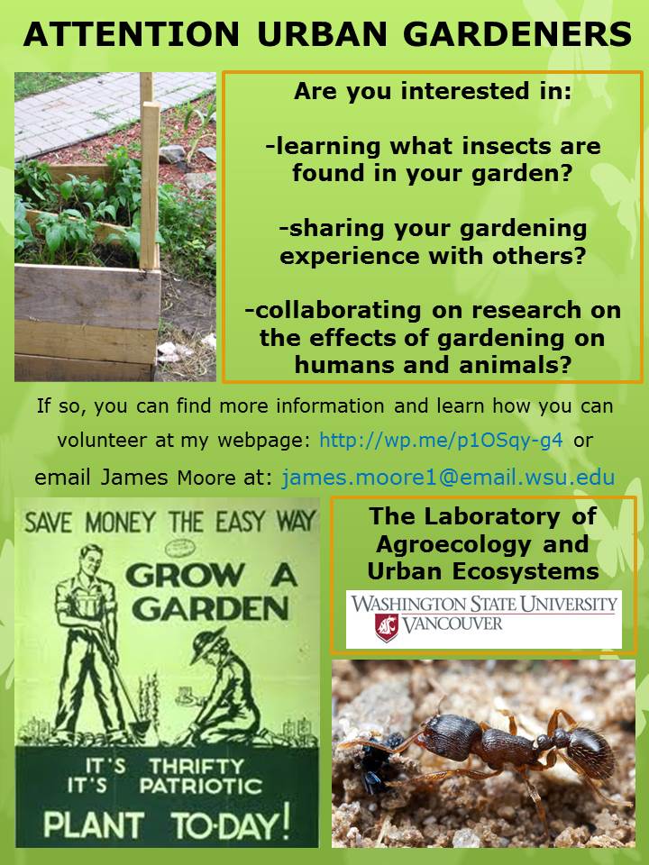 First and foremost I am looking for gardeners that live and garden in Portland, Oregon that would be willing to collaborate with me as I research urban agriculture. Specifically, I’m looking for gardeners to help me write their experience with urban agriculture (you remain completely anonymous) and to allow my research group (3-4 people) to sample insects in their garden.